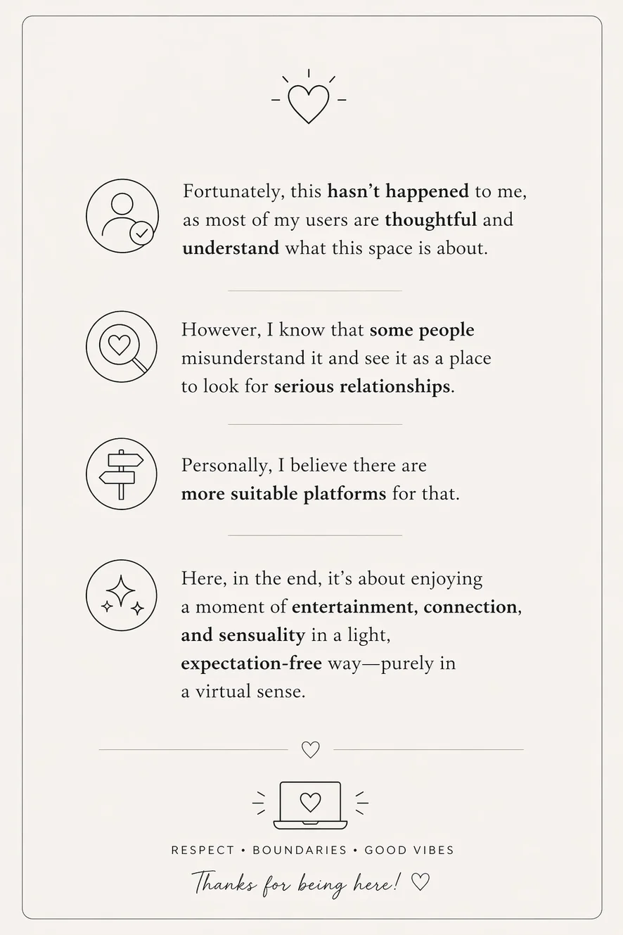 Personalmente, creo que para eso existen medios más adecuados. Aquí, al final, se trata de disfrutar un momento de entretenimiento 🎭, conexión y sensualidad , de forma ligera y sin expectativas , y obviamente todo en lo virtual 💻💖